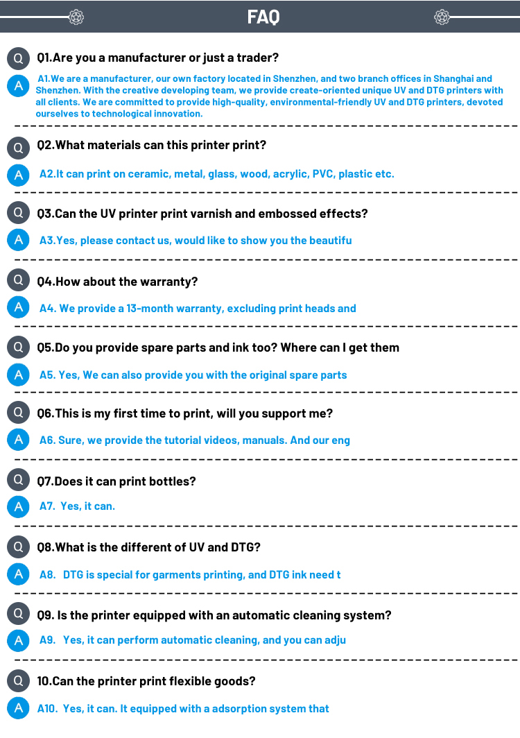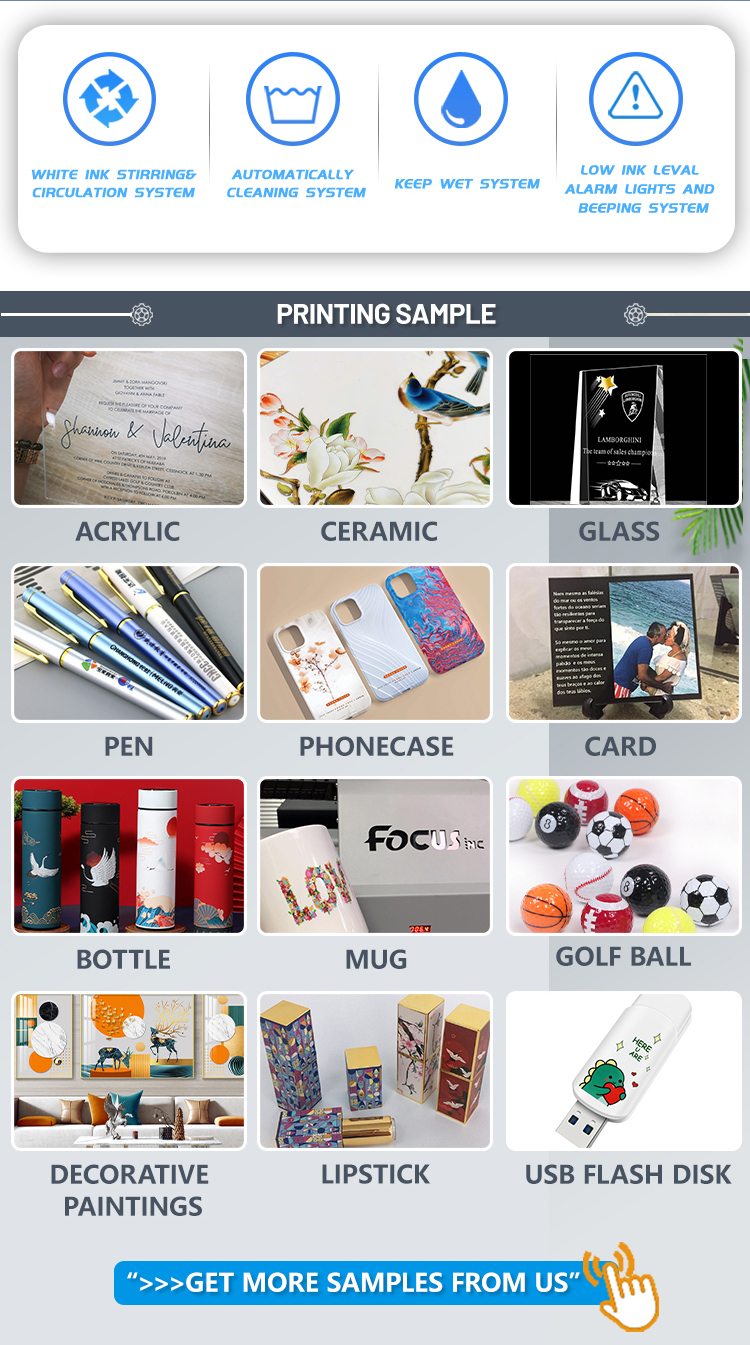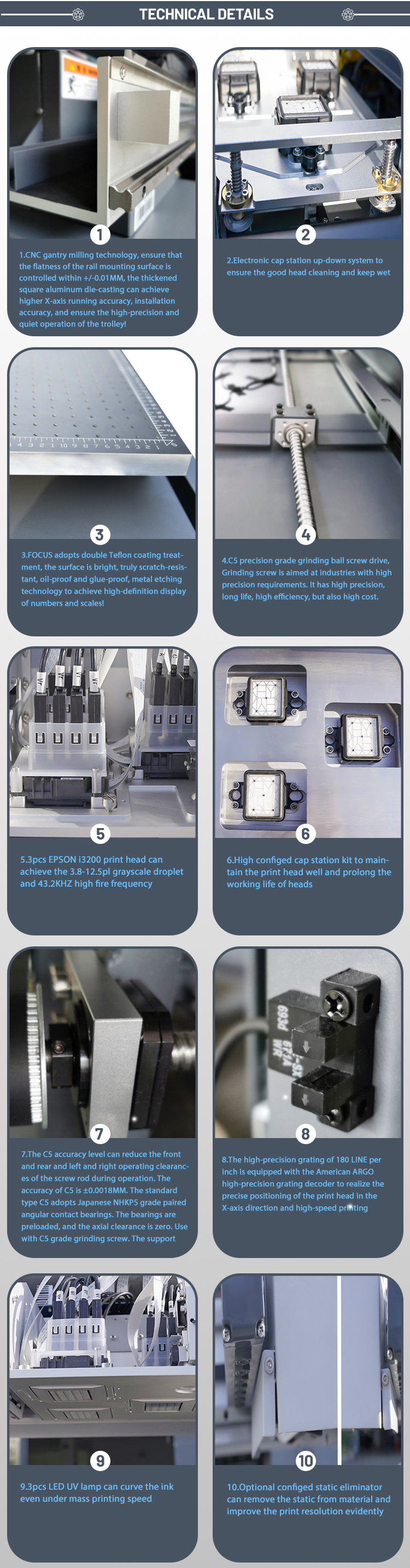 * 1 head, 2 heads, and 3 heads configuration (preferably 3 heads: CMYK + White + Varnish)